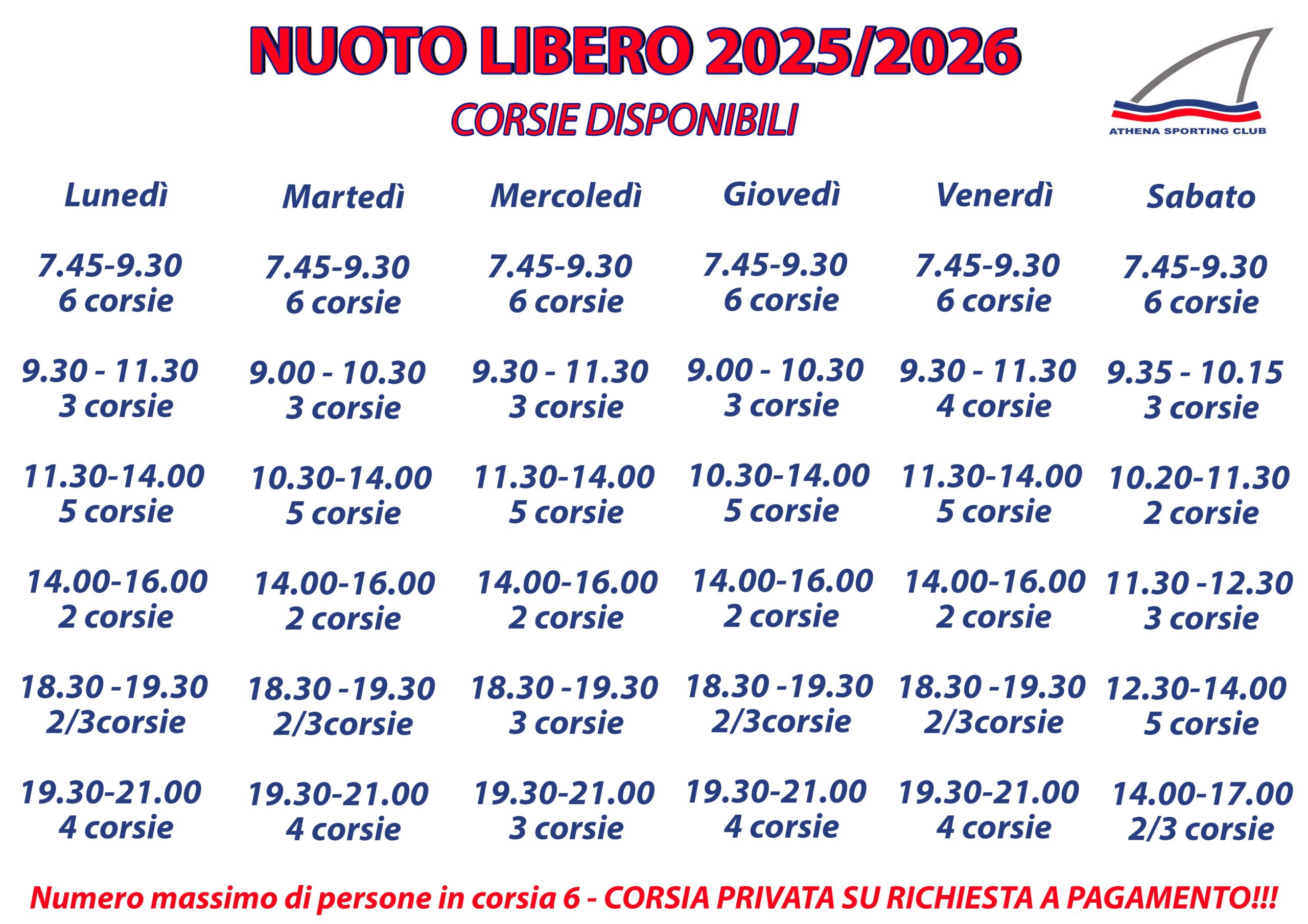 Le corsie a disposizione del nuoto libero variano in base agli orari, la capienza massima della singola corsia è di 5 utenti.